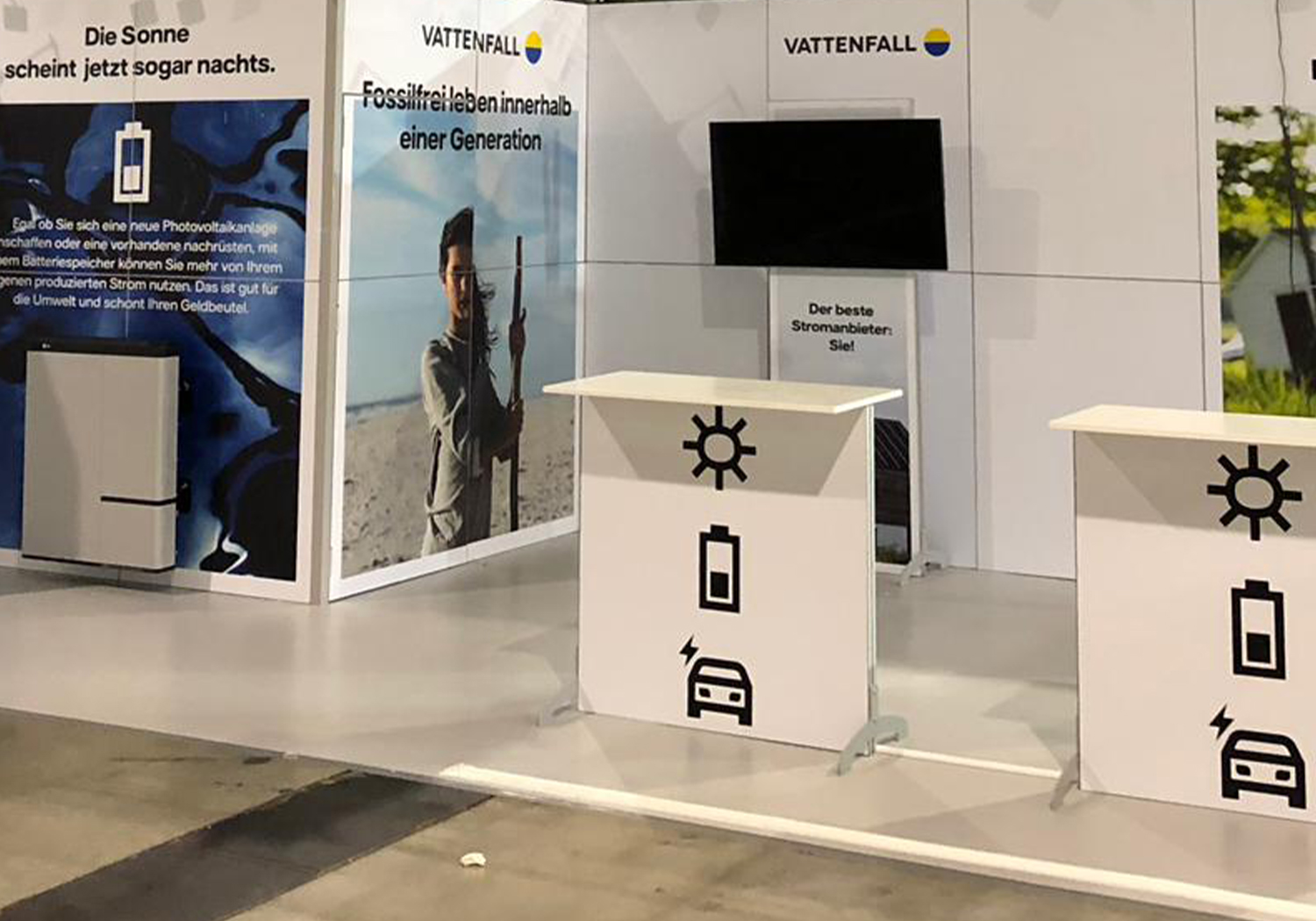 Für eine Messe suchte Vattenfall ein in einem Messestand integrierbares, kostengünstiges Digitial Signage System mit Fokus au eine leichte und robuste Montage, sowie einer rudimentären, aber einfachen Inhaltsbereitstellung mittels im Display integriertem Medienplayer für gängige Bild- und Videoformate.